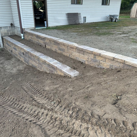 Revitalize with Redline Lawn and Landscape: We replaced a decaying timber wall, fixed drainage, and built a sturdy two-tiered block retaining wall. Elevate your landscape with our lasting solutions.